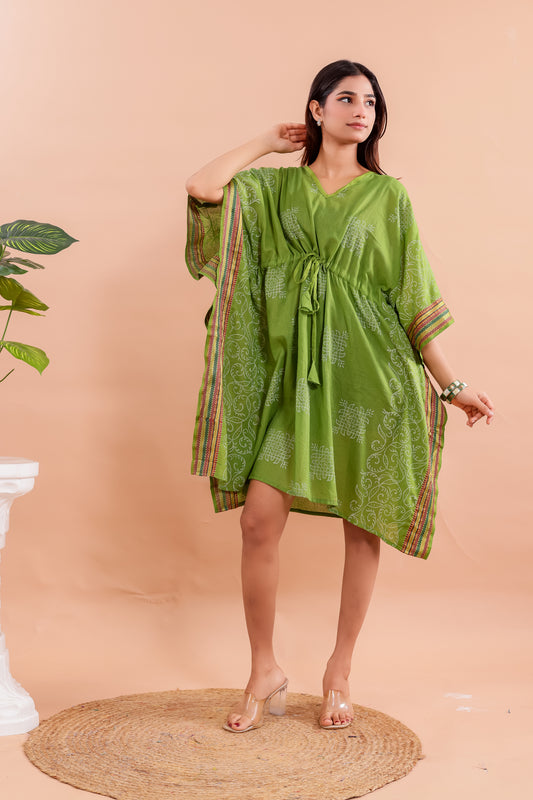 Lime Green Hand Block Printed Cotton Kaftan with Ethnic White Motifs