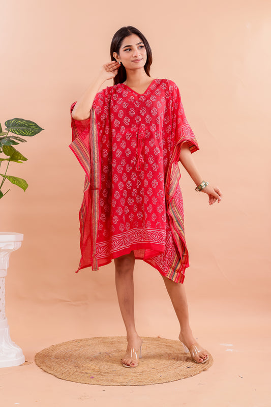 Vibrant Red Hand Block Printed Cotton Kaftan with Side Stripe Accents