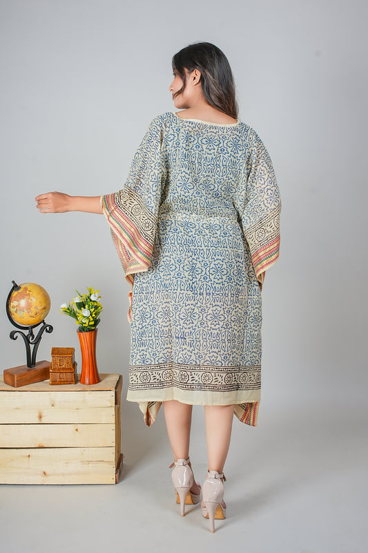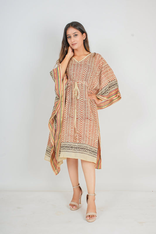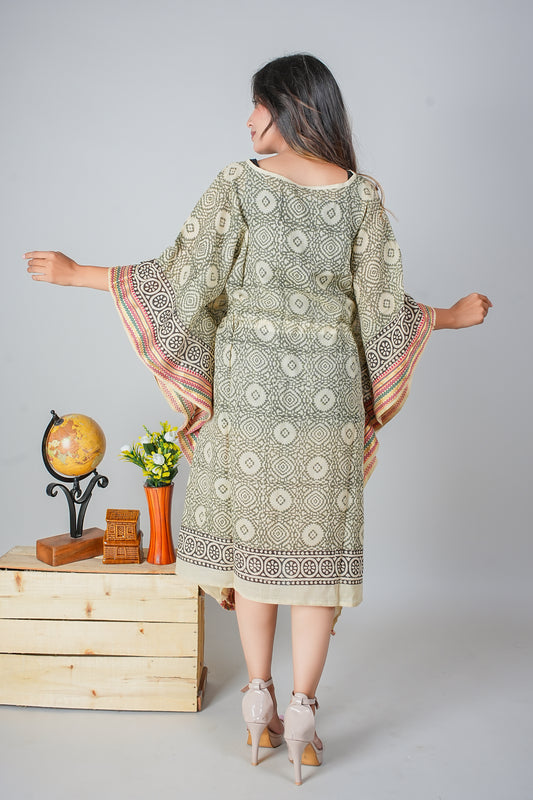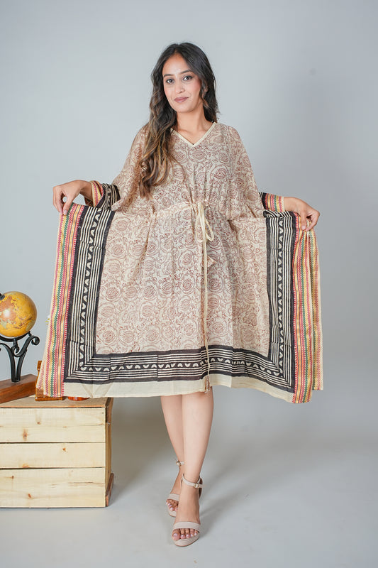 Hand Block Printed Cotton Kaftan Dress – Earthy Waves & Tribal Border (Free Size)