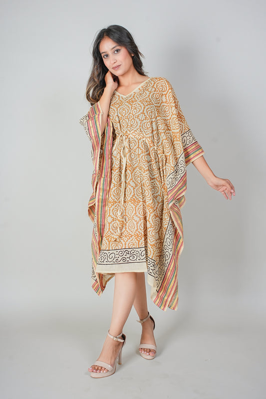 Hand Block Printed Cotton Kaftan Dress – Mustard Floral Jaal with Ethnic Borders (Free Size)