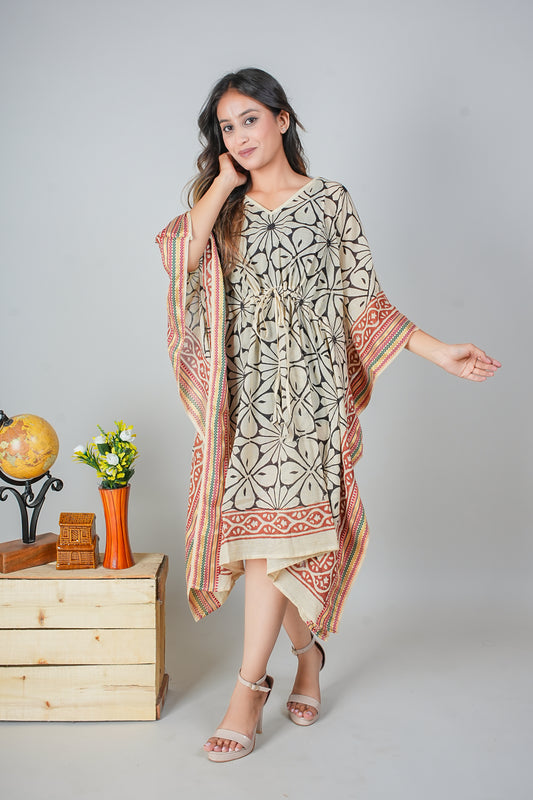 Cream Beige Hand Block Printed Cotton Kaftan with Circular Motifs